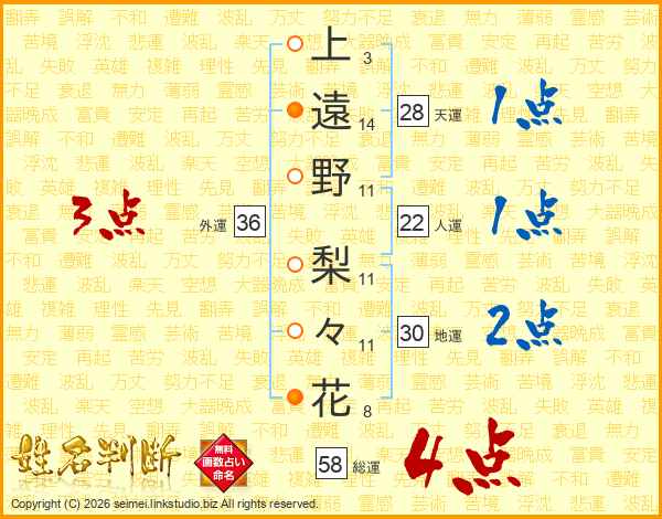 上(3画)遠(14画)野(11画) 梨(11画)々(11画)花(8画)