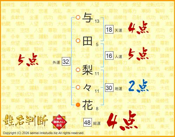 与(13画)田(5画) 梨(11画)々(11画)花(8画)