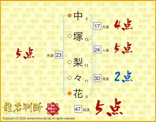 中(4画)塚(13画) 梨(11画)々(11画)花(8画)