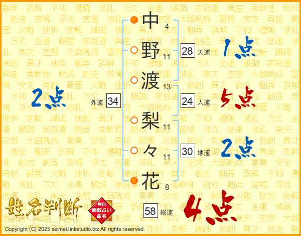 中(4画)野(11画)渡(13画)  梨(11画)々(11画)花(8画)
