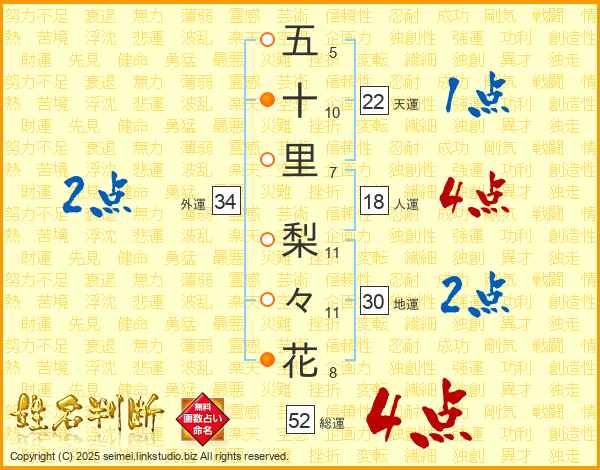 五(5画)十(10画)里(7画) 梨(11画)々(11画)花(8画)