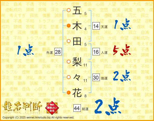 五(5画)木(4画)田(5画) 梨(11画)々(11画)花(8画)