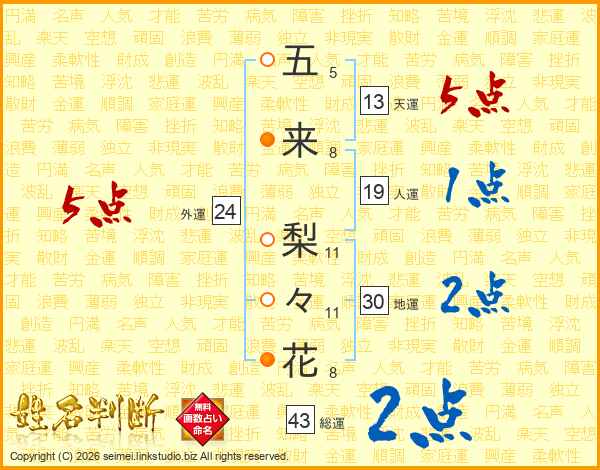 五(5画)来(8画) 梨(11画)々(11画)花(8画)