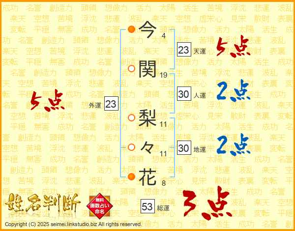 今(4画)関(19画) 梨(11画)々(11画)花(8画)