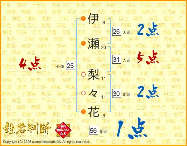 伊(6画)瀬(20画) 梨(11画)々(11画)花(8画)