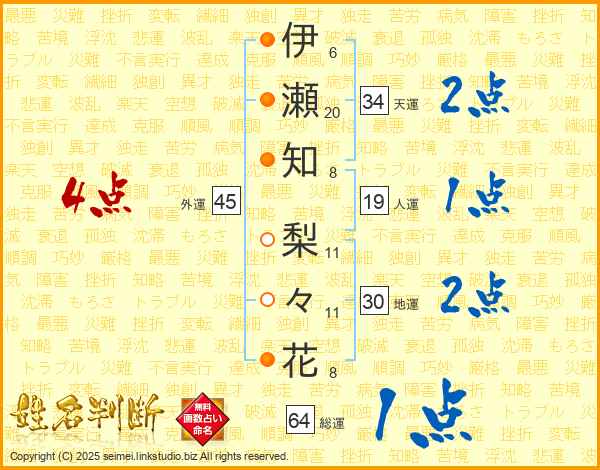伊(6画)瀬(20画)知(8画) 梨(11画)々(11画)花(8画)