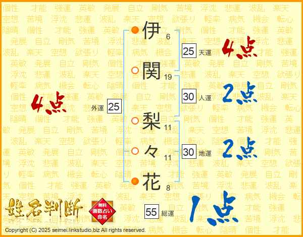 伊(6画)関(19画) 梨(11画)々(11画)花(8画)
