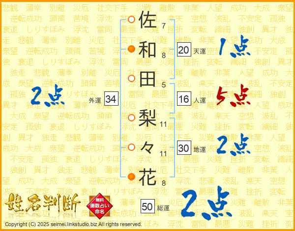 佐(7画)和(8画)田(5画) 梨(11画)々(11画)花(8画)
