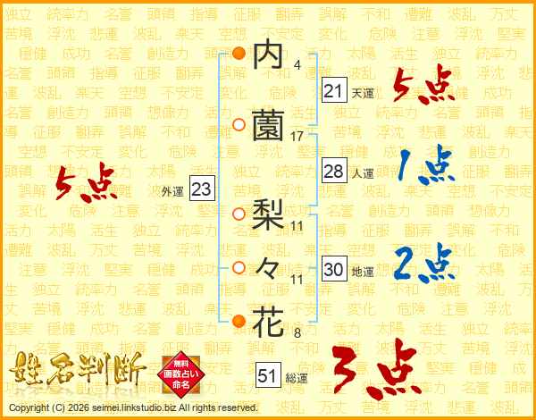 内(4画)薗(17画) 梨(11画)々(11画)花(8画)