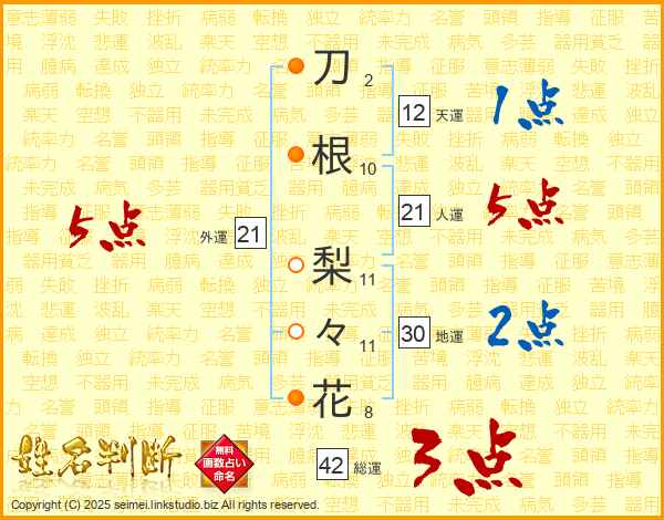 刀(2画)根(10画)  梨(11画)々(11画)花(8画)