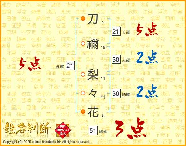 刀(2画)禰(19画) 梨(11画)々(11画)花(8画)