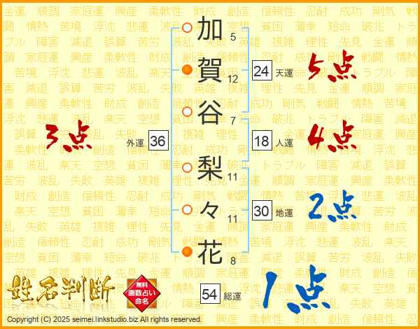 加(5画)賀(12画)谷(7画) 梨(11画)々(11画)花(8画)