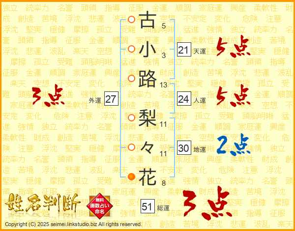 古(5画)小(3画)路(13画) 梨(11画)々(11画)花(8画)