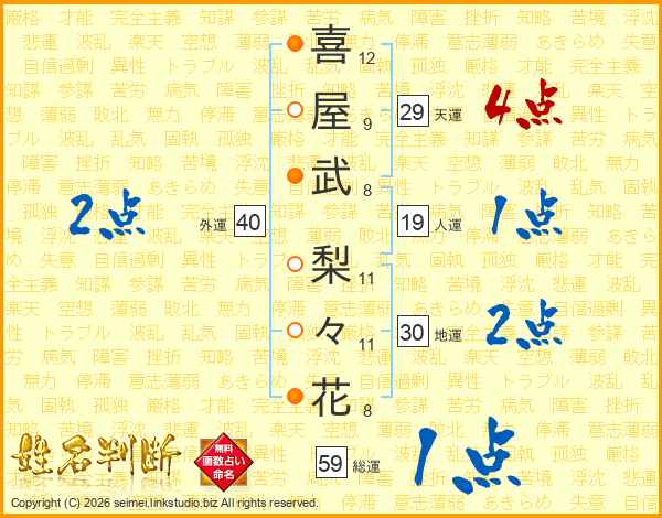 喜(12画)屋(9画)武(8画) 梨(11画)々(11画)花(8画)