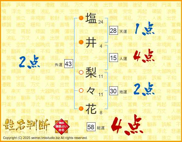 塩(24画)井(4画)  梨(11画)々(11画)花(8画)