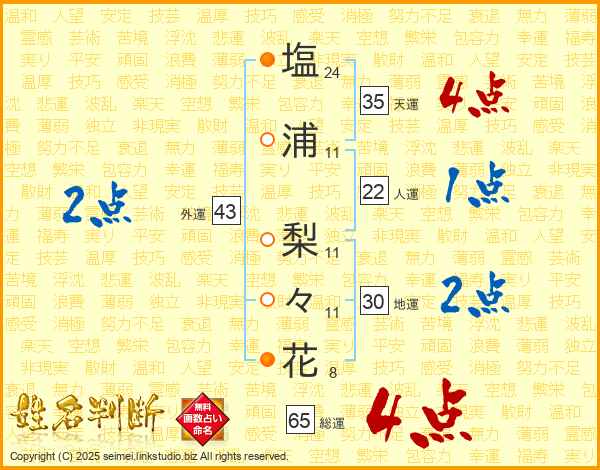 塩(24画)浦(11画) 梨(11画)々(11画)花(8画)