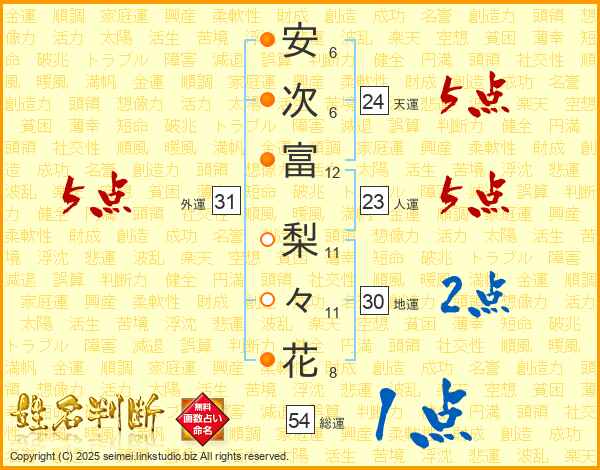安(6画)次(6画)富(12画)  梨(11画)々(11画)花(8画)