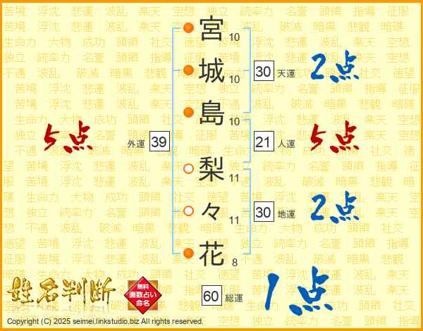 宮(10画)城(10画)島(10画) 梨(11画)々(11画)花(8画)