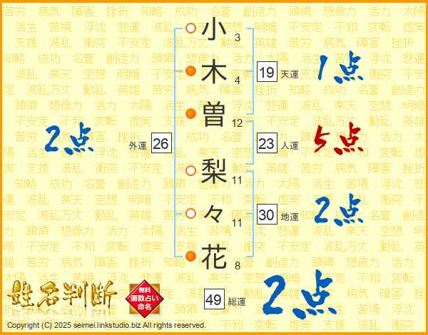 小(3画)木(4画)曽(12画) 梨(11画)々(11画)花(8画)