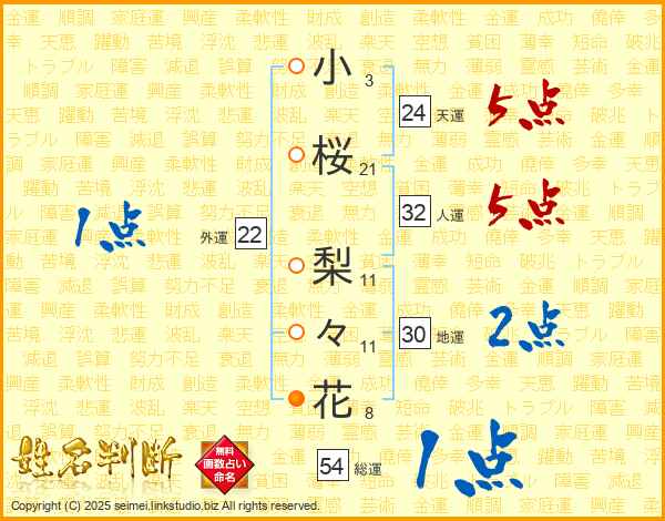 小(3画)桜(21画) 梨(11画)々(11画)花(8画)