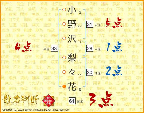 小(3画)野(11画)沢(17画) 梨(11画)々(11画)花(8画)