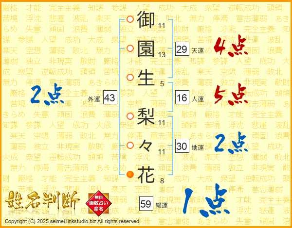 御(11画)園(13画)生(5画) 梨(11画)々(11画)花(8画)