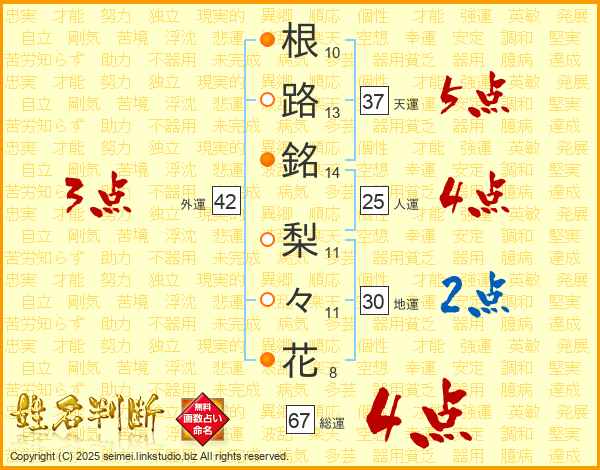 根(10画)路(13画)銘(14画) 梨(11画)々(11画)花(8画)