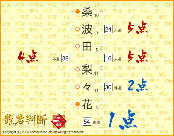桑(10画)波(9画)田(5画) 梨(11画)々(11画)花(8画)