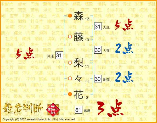森(12画)藤(19画) 梨(11画)々(11画)花(8画)