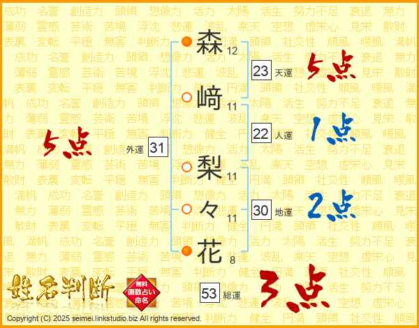 森(12画)﨑(11画) 梨(11画)々(11画)花(8画)