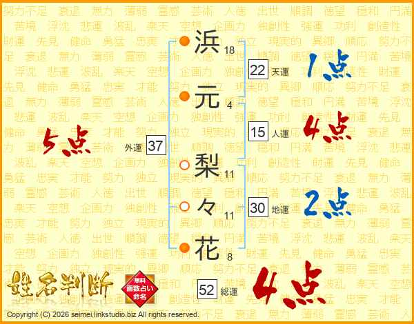 浜(18画)元(4画) 梨(11画)々(11画)花(8画)