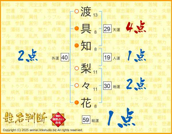 渡(13画)具(8画)知(8画) 梨(11画)々(11画)花(8画)