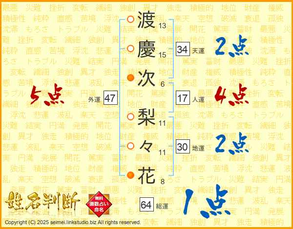 渡(13画)慶(15画)次(6画) 梨(11画)々(11画)花(8画)