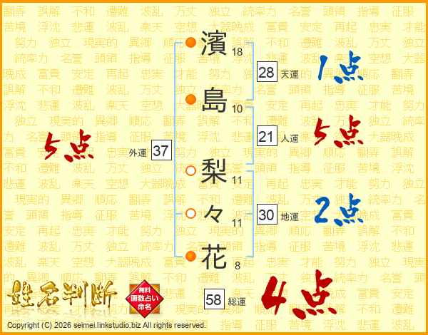 濱(18画)島(10画) 梨(11画)々(11画)花(8画)