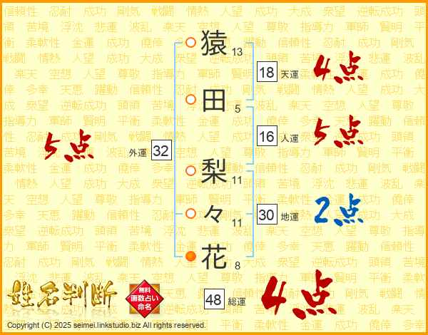猿(13画)田(5画) 梨(11画)々(11画)花(8画)
