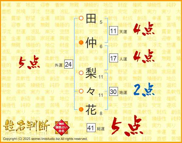 田(5画)仲(6画) 梨(11画)々(11画)花(8画)
