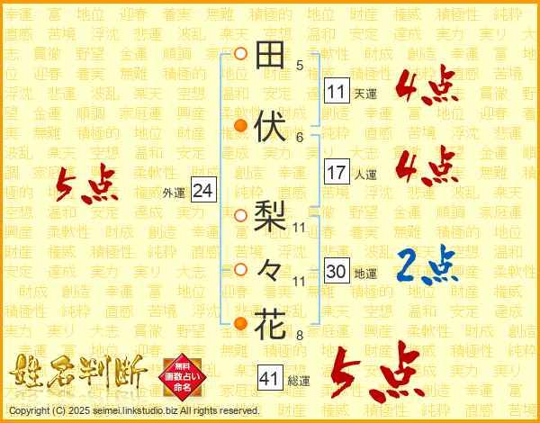 田(5画)伏(6画) 梨(11画)々(11画)花(8画)