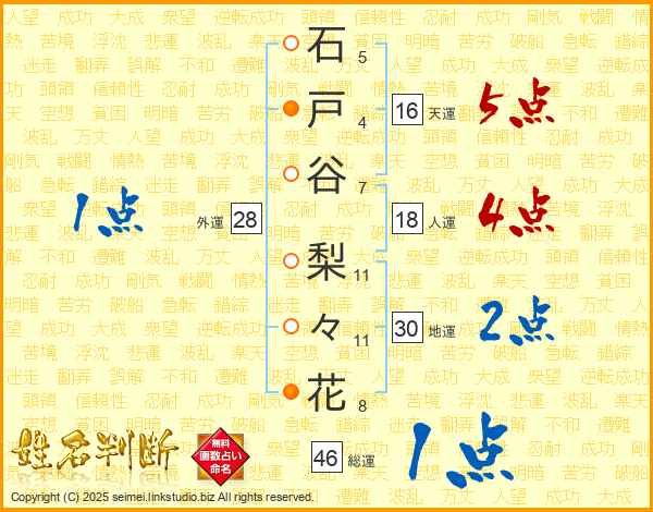 石(5画)戸(4画)谷(7画) 梨(11画)々(11画)花(8画)