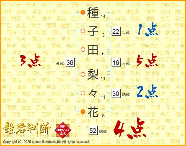 種(14画)子(3画)田(5画) 梨(11画)々(11画)花(8画)
