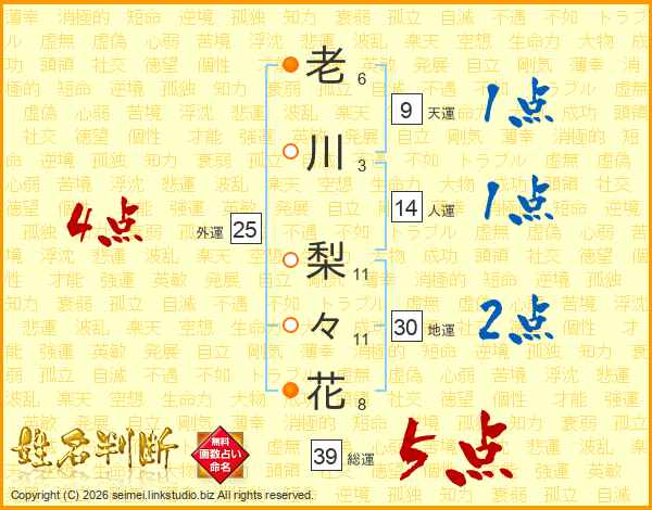 生活面を象徴する運勢です。外部から受ける影響力を表し、結婚運、家庭運や職場、環境への順応性を表します。総運から人運を引いた画数。姓や名が1文字の場合を除く。