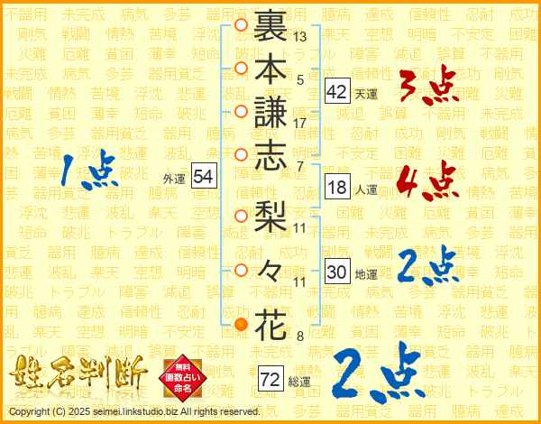 裏(13画)本(5画)謙(17画)志(7画) 梨(11画)々(11画)花(8画)