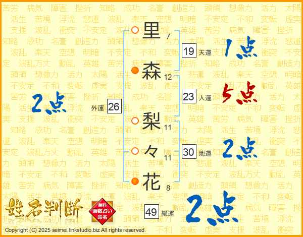 里(7画)森(12画)  梨(11画)々(11画)花(8画)