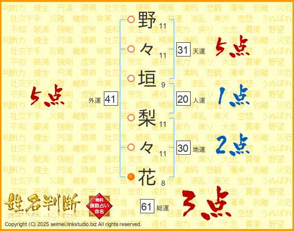 野(11画)々(11画)垣(9画) 梨(11画)々(11画)花(8画)