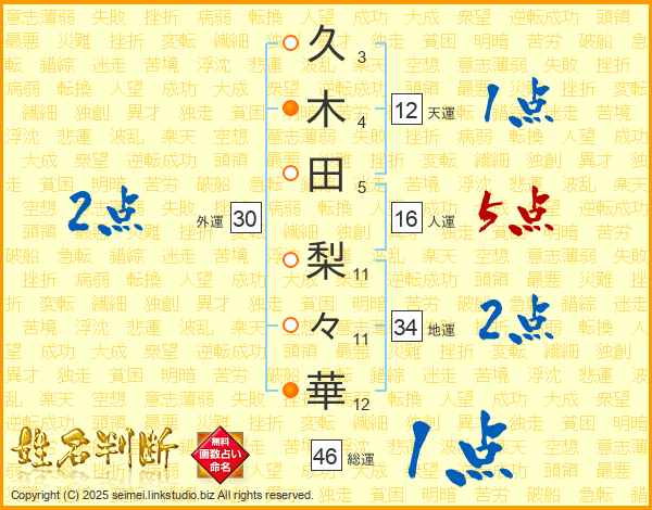 久(3画)木(4画)田(5画) 梨(11画)々(11画)華(12画)