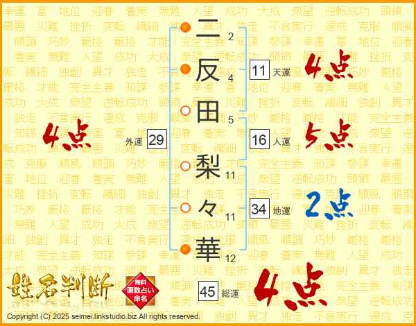 二(2画)反(4画)田(5画) 梨(11画)々(11画)華(12画)