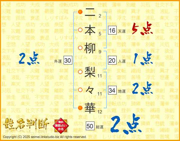 二(2画)本(5画)柳(9画) 梨(11画)々(11画)華(12画)
