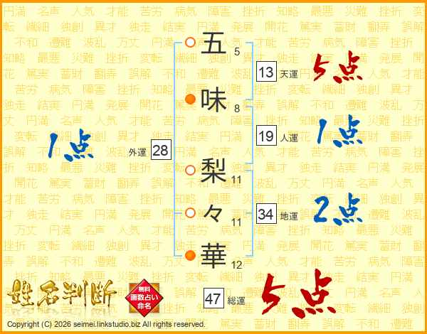 五(5画)味(8画) 梨(11画)々(11画)華(12画)