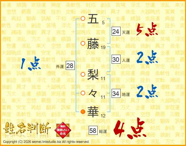 五(5画)藤(19画) 梨(11画)々(11画)華(12画)