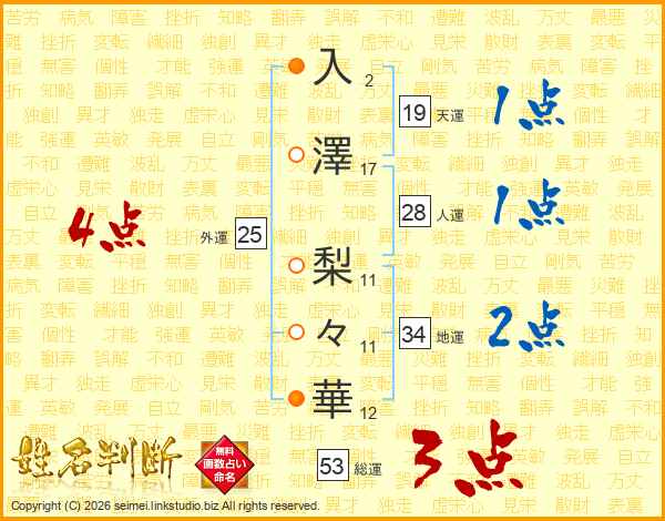 入(2画)澤(17画) 梨(11画)々(11画)華(12画)