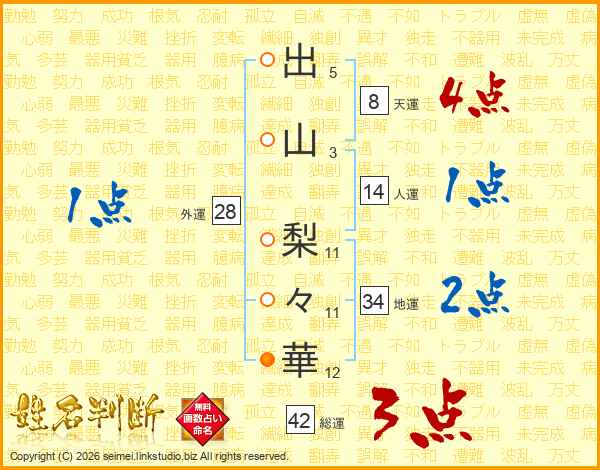 出(5画)山(3画) 梨(11画)々(11画)華(12画)